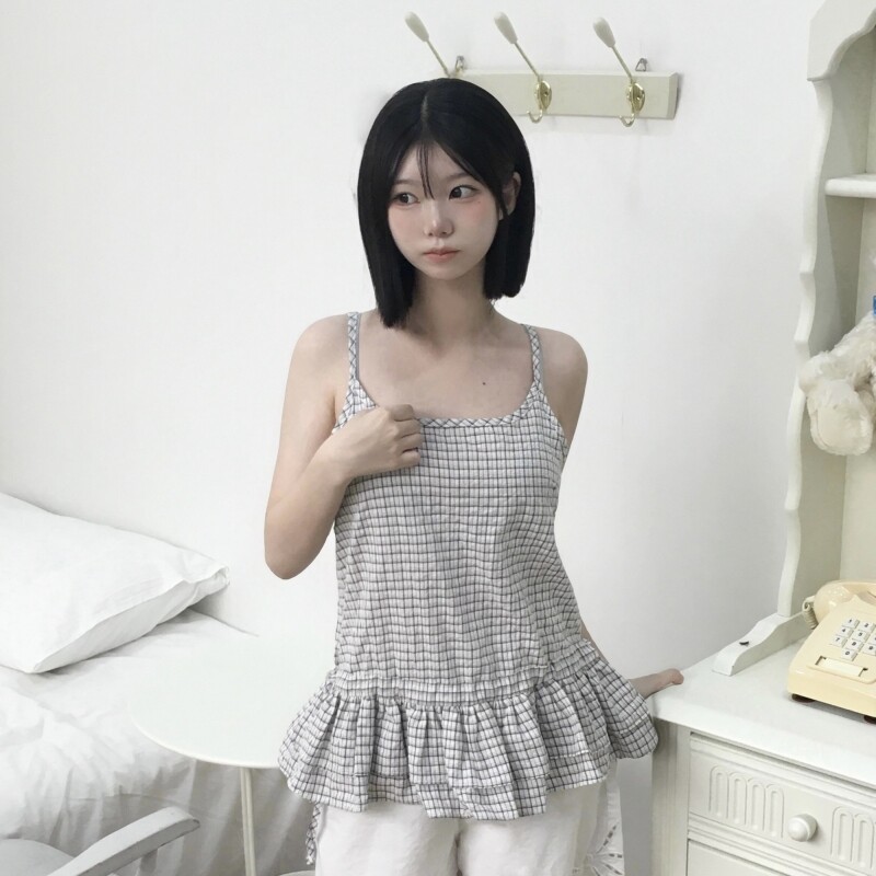 123# 체크 캉캉 사이드 리본 나시